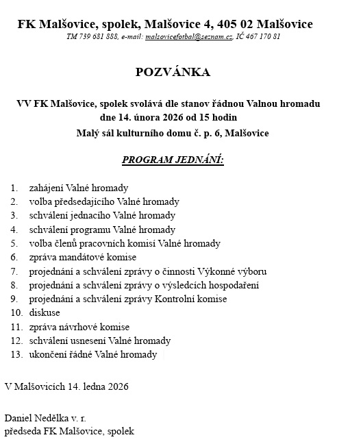 Valná hromada FK Malšovice sobota 14.02.2026